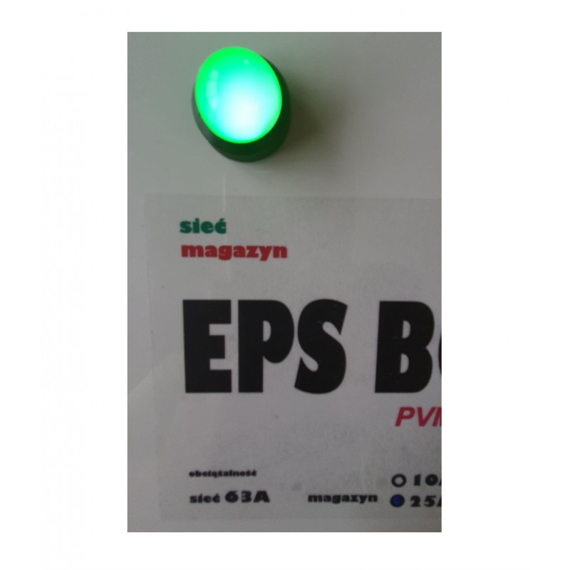 Na płycie przedniej umieszczono dużą sygnalizację świetlną informującą o trybie pracy urządzenia, zasilanie z sieci (zielona), zasilanie z magazynu energii (czerwona).
