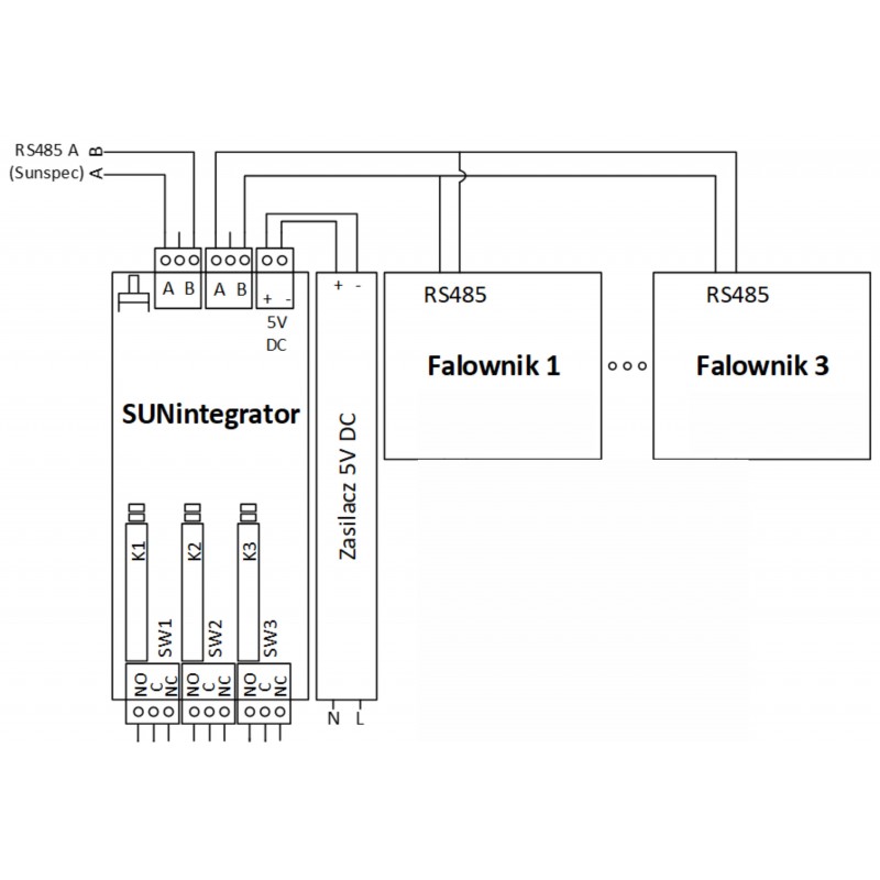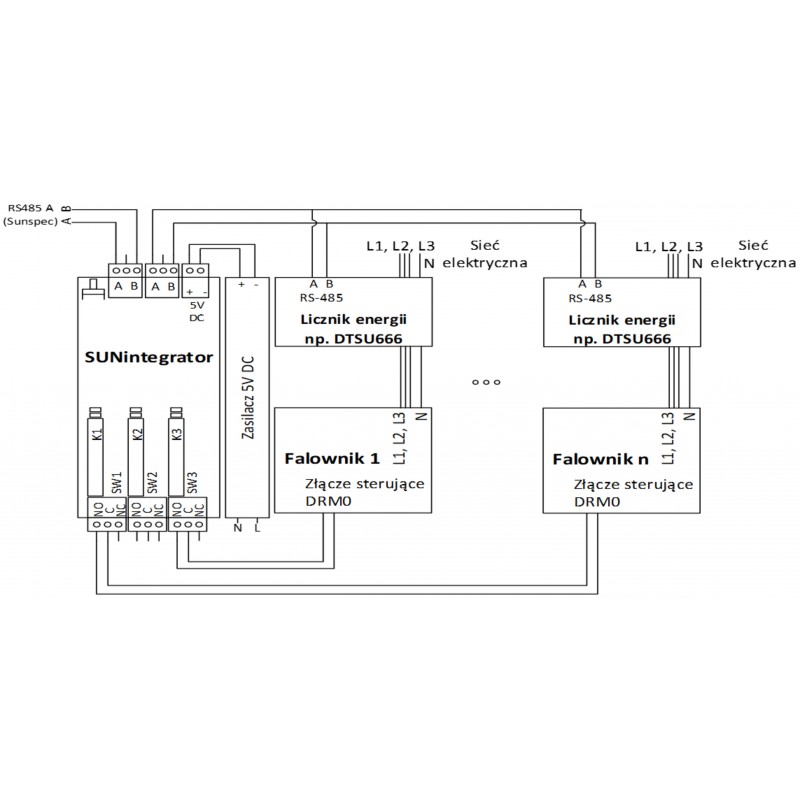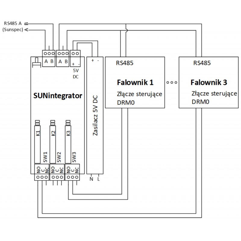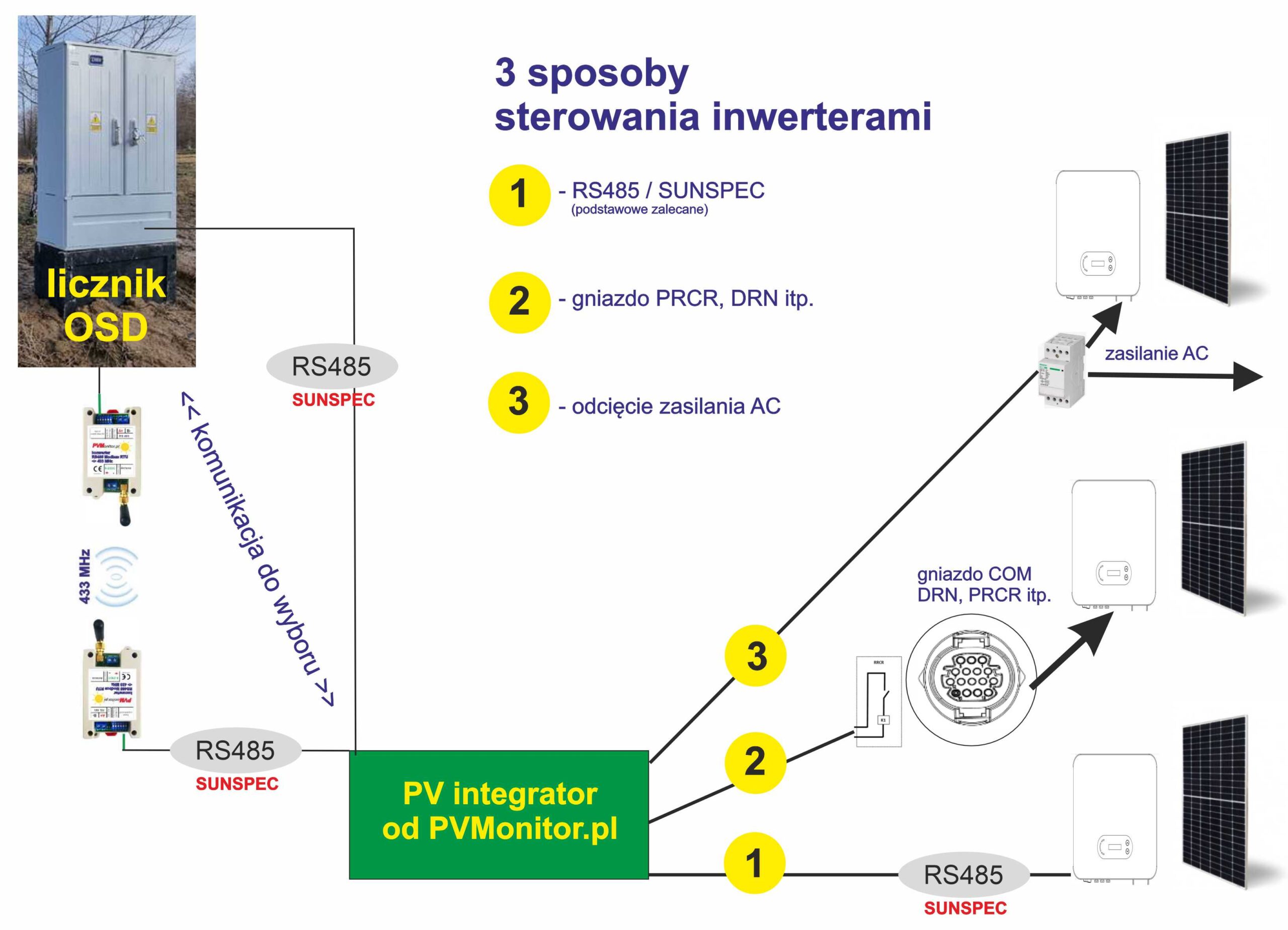 Niezależnie od sposobu sterowania wyłączeniem inwerterów do naszego PVintegratora należy doprowadzić komunikację RS485 z każdym z inwerterów w celu czytania podstawowych danych z każdego inwertera. W zależności od typu inwertera komunikacja wi-fi, kablowa lub przez konwerter RS485<>433MHz.