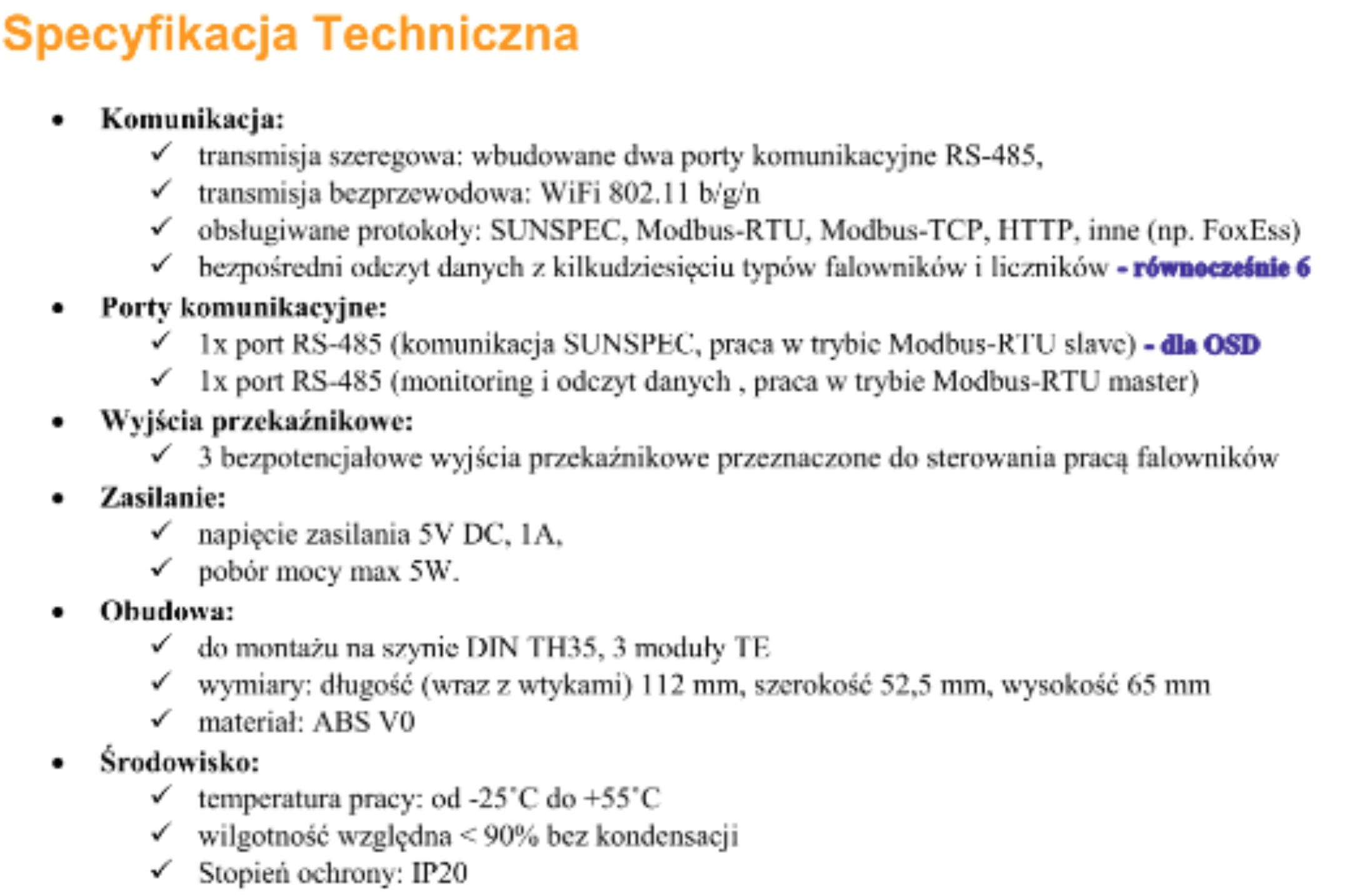obsługa do 6 inwerterów i liczników z portem RS485 i protokołem Modbus-RTU lub kartą TCP/IP, urządzenie obsługuje: