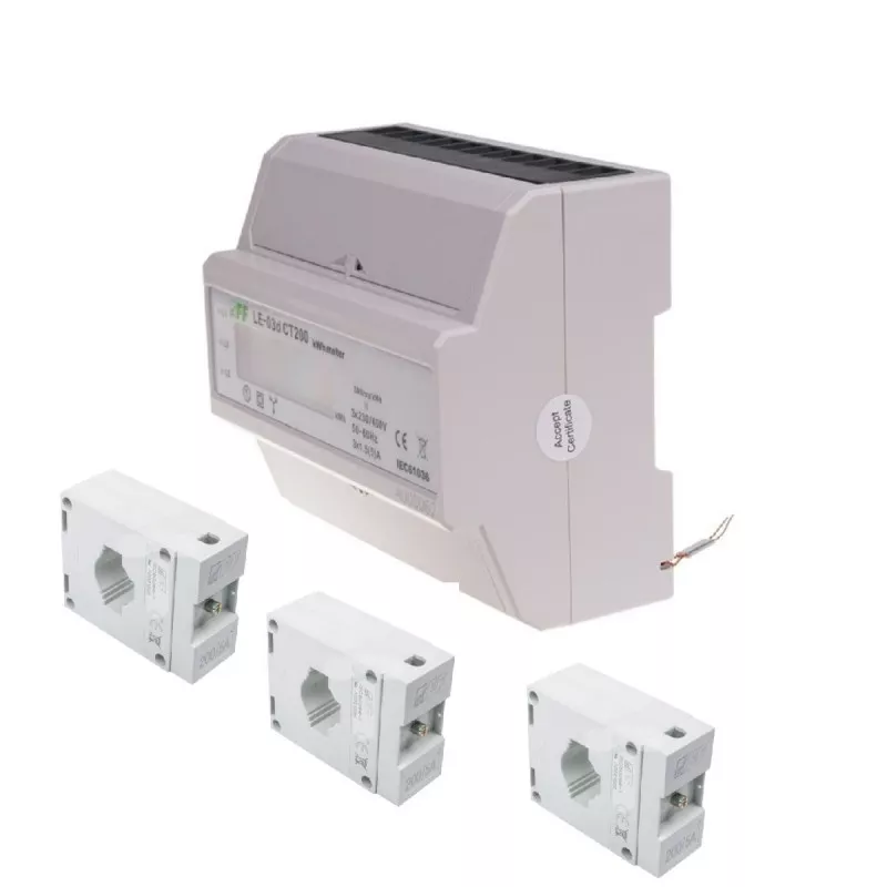 200A – Licznik 3F (trójfazowy z wyjściem impulsowym) produkcji lub zużycia energii o obciążalności 200A.