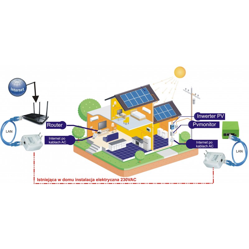 Moduł internet po kablach AC nie wymaga żadnej konfiguracji czy parowania, wystarczy włączyć i po kilku sekundach działa. Po podłączeniu należy jedynie zrestartować nasz moduł PVmonitor.pl.